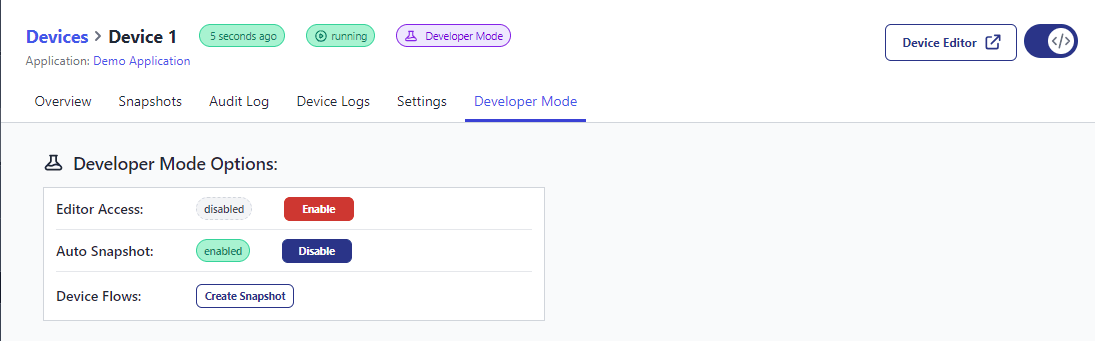 - Developer Mode: Blocks any new Target Snapshots running, but allows for remote editing on the Device.